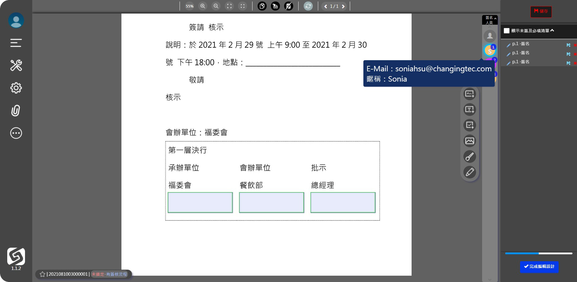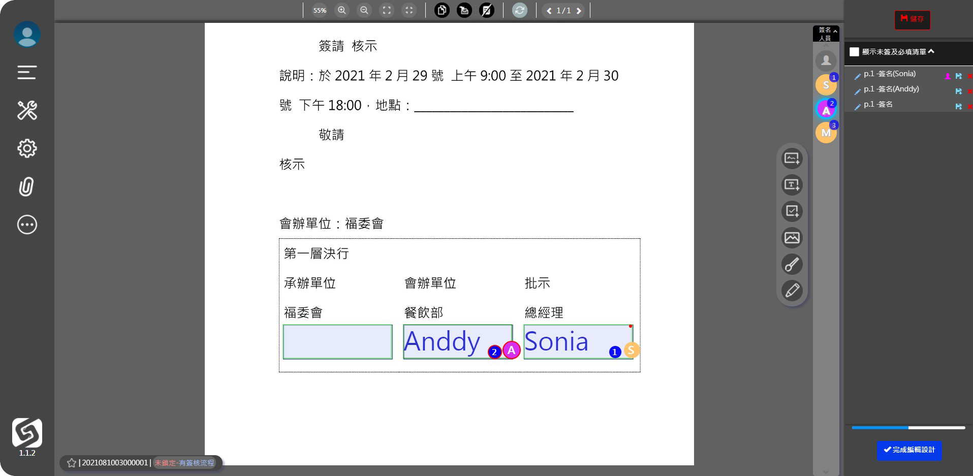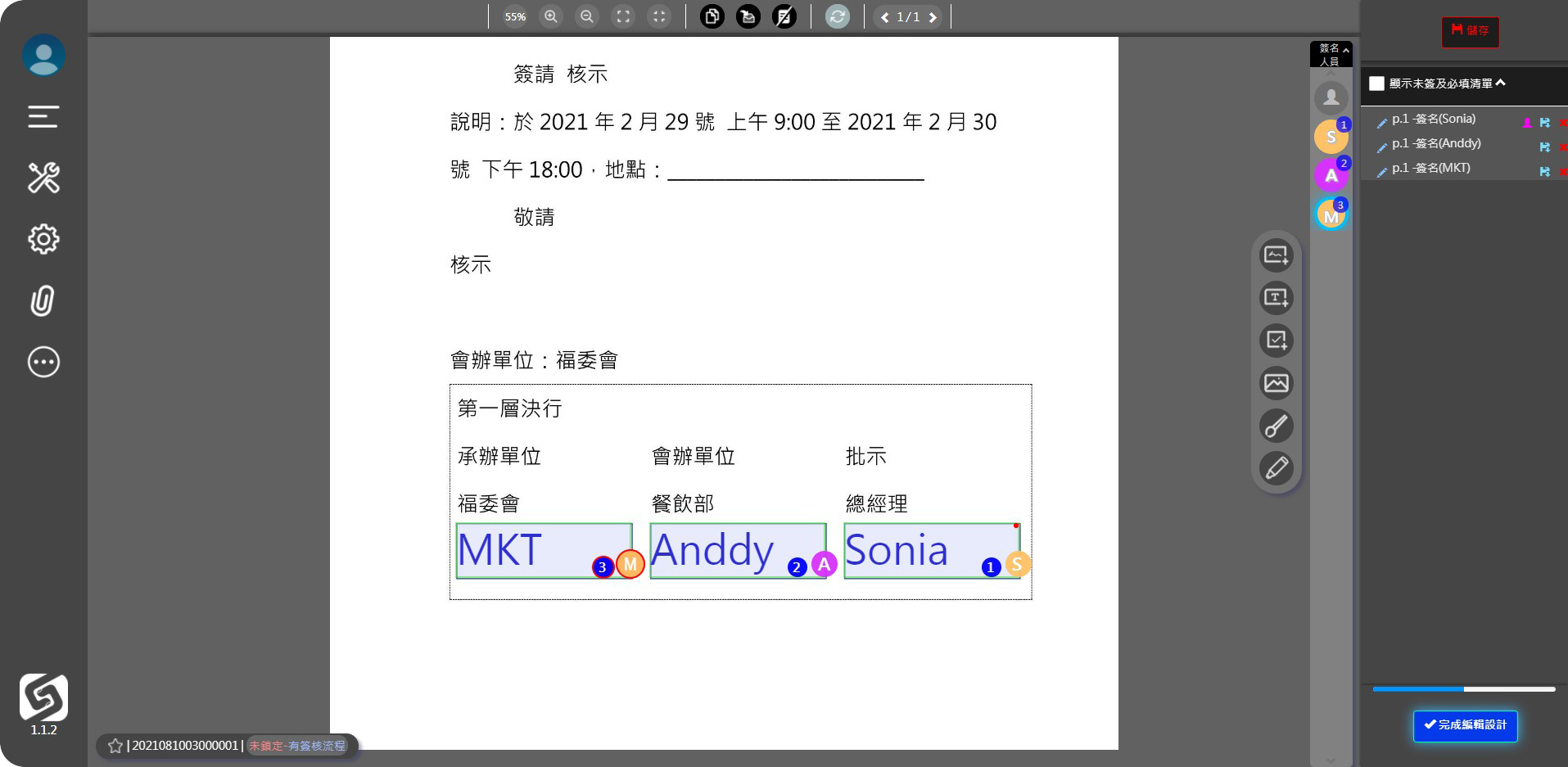 ● 選擇右列的人員,再點擊其簽名欄位,依此類推