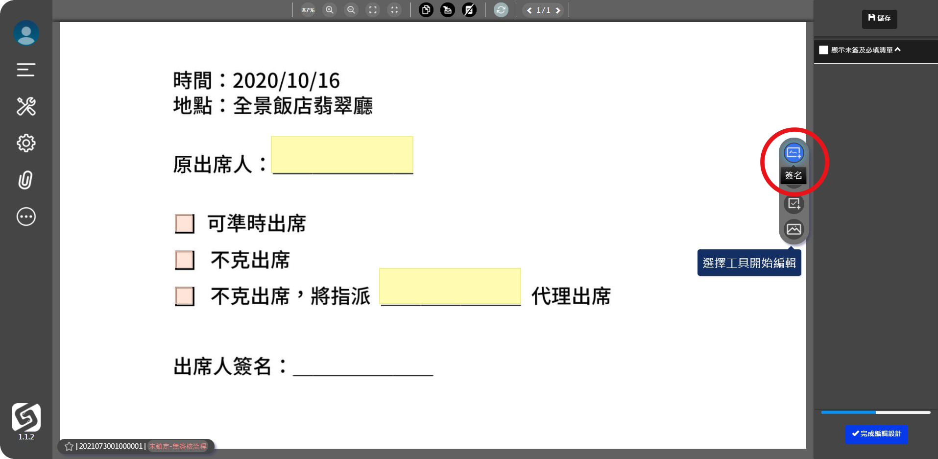 ● 右列快捷工具,選擇簽名功能鍵